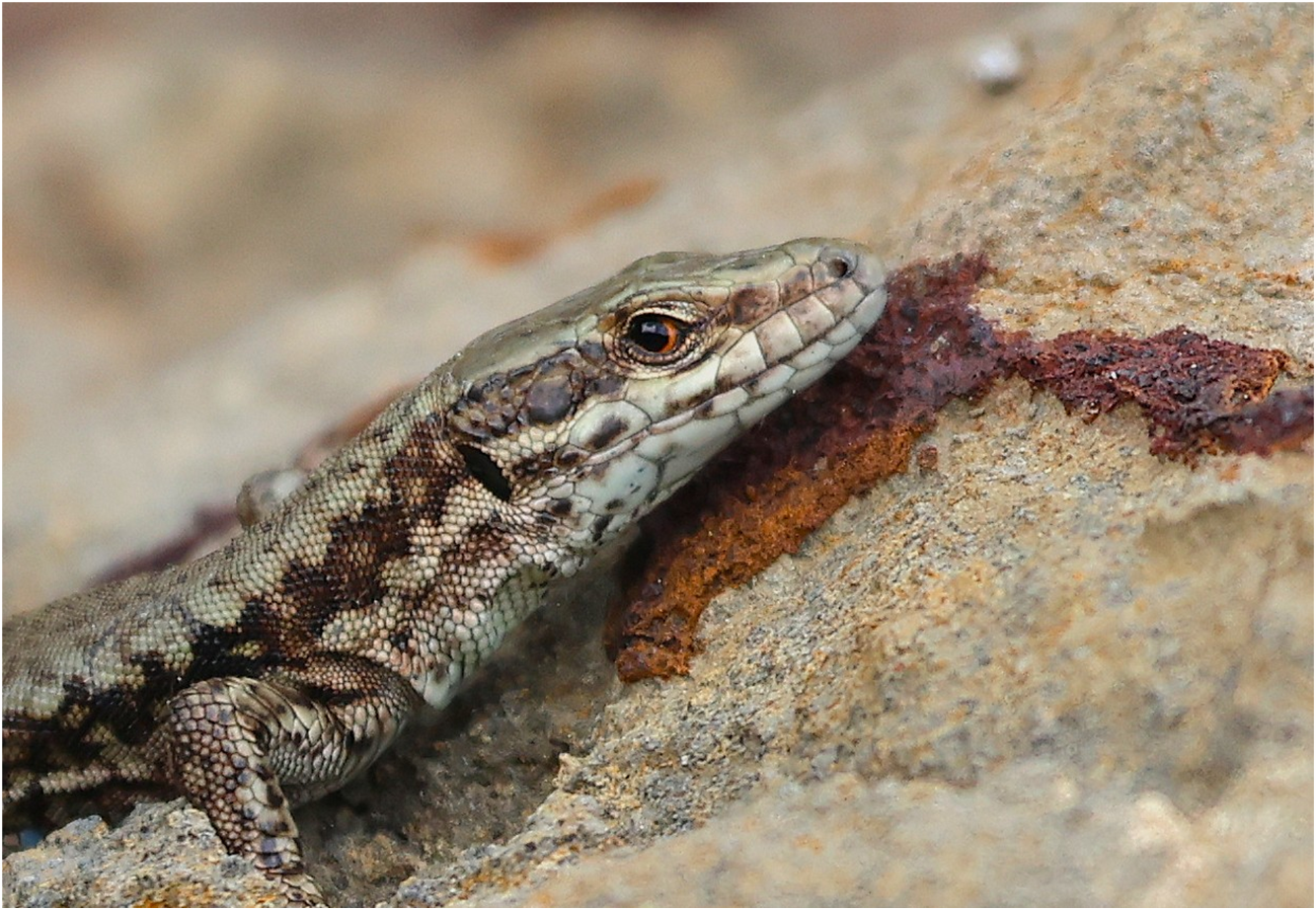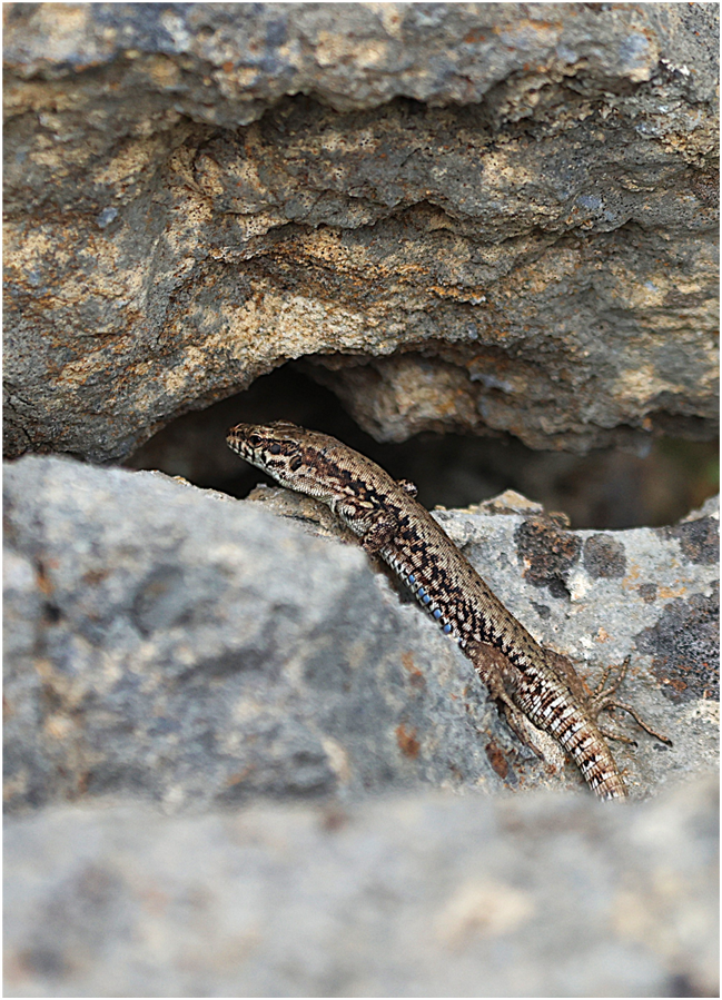 Die Mauereidechse (Podarcis muralis) wird bis zu 25 cm lang, ist tagaktiv und ausgezeichnet im Klettern. Sie erreicht meist ein Alter von 4–6 Jahren, selten bis zu 10 Jahren. Früher war sie überwiegend im Tessin verbreitet, heute findet man sie auch in der Nordschweiz an warmen, trockenen Standorten. Jedes Tier beansprucht ein Revier von 15–60 m². Sie jagen dort nach Insekten, Spinnen, Asseln und anderen Wirbellosen. Fotos: Erlinsbach 22.04.25