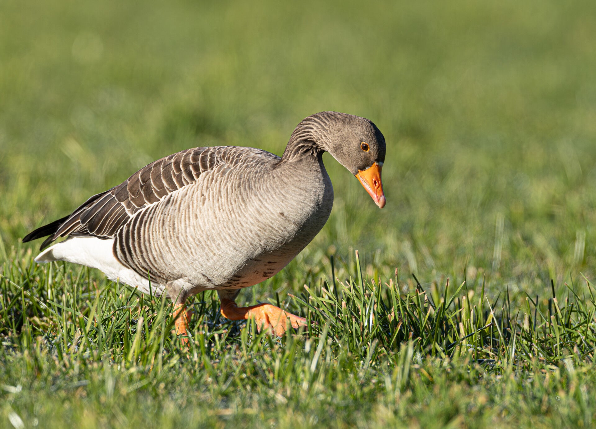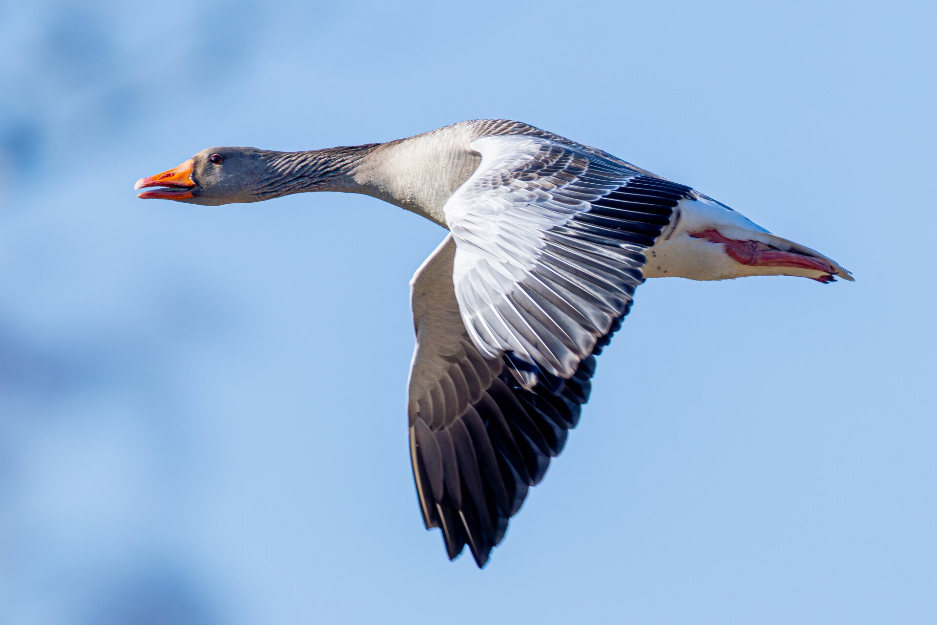 Die Graugans (Anser anser) ist die grösste und häufigste wild lebende Gänseart Europas und gilt als Stammform der Hausgans. In der Schweiz ist sie ein regelmässiger Brut- und Durchzugsvogel, der an grossen Seen, Flüssen und Feuchtgebieten lebt. Graugänse sind bekannt für ihre starke Partnerbindung – viele Paare bleiben ein Leben lang zusammen. Während der Brutzeit verteidigen die Männchen ihr Revier mit grosser Entschlossenheit, während beide Eltern gemeinsam für die Aufzucht der Jungen sorgen. Ihr Orientierungssinn ist aussergewöhnlich präzise: Oft kehren Graugänse Jahr für Jahr an denselben Brut- oder Rastplatz zurück. Diese Eigenschaften sind ein weiterer Beleg für Gottes schöpferisches Werk. Länge: 75–90 cm / Spannweite: 147–180 cm / Gewicht: 2900–3700 g.