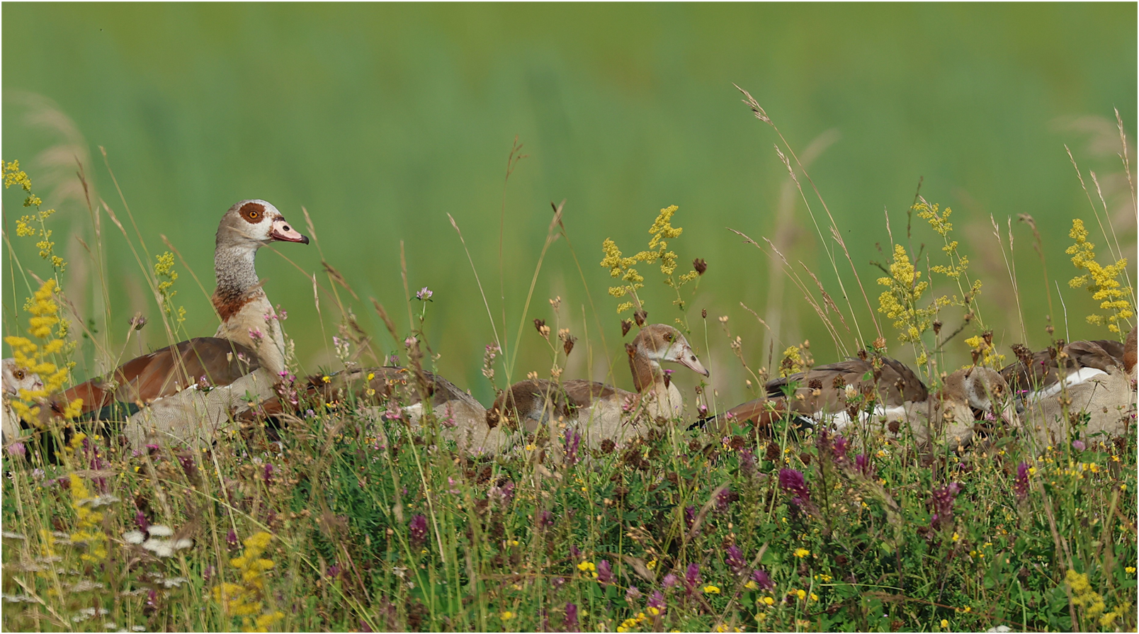 Die Nilgans (Alopochen aegyptiaca). Ursprünglich war diese farbenprächtige Art fast ganz Afrika ausser den extremen Trockengebieten beheimatet. Ausgehend von einer in den 1970er Jahren in den Niederlanden und Belgien gebildeten Population breitete sich die Nilgans rasant dem Rhein und seinen Nebenflüssen entlang aus und hat inzwischen auch die Schweiz erreicht.