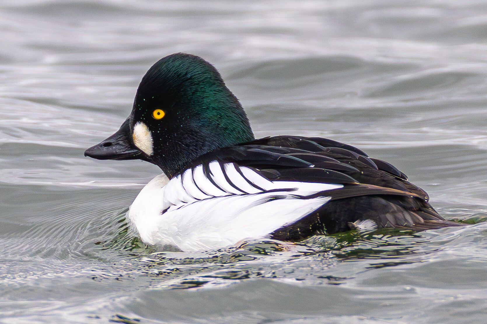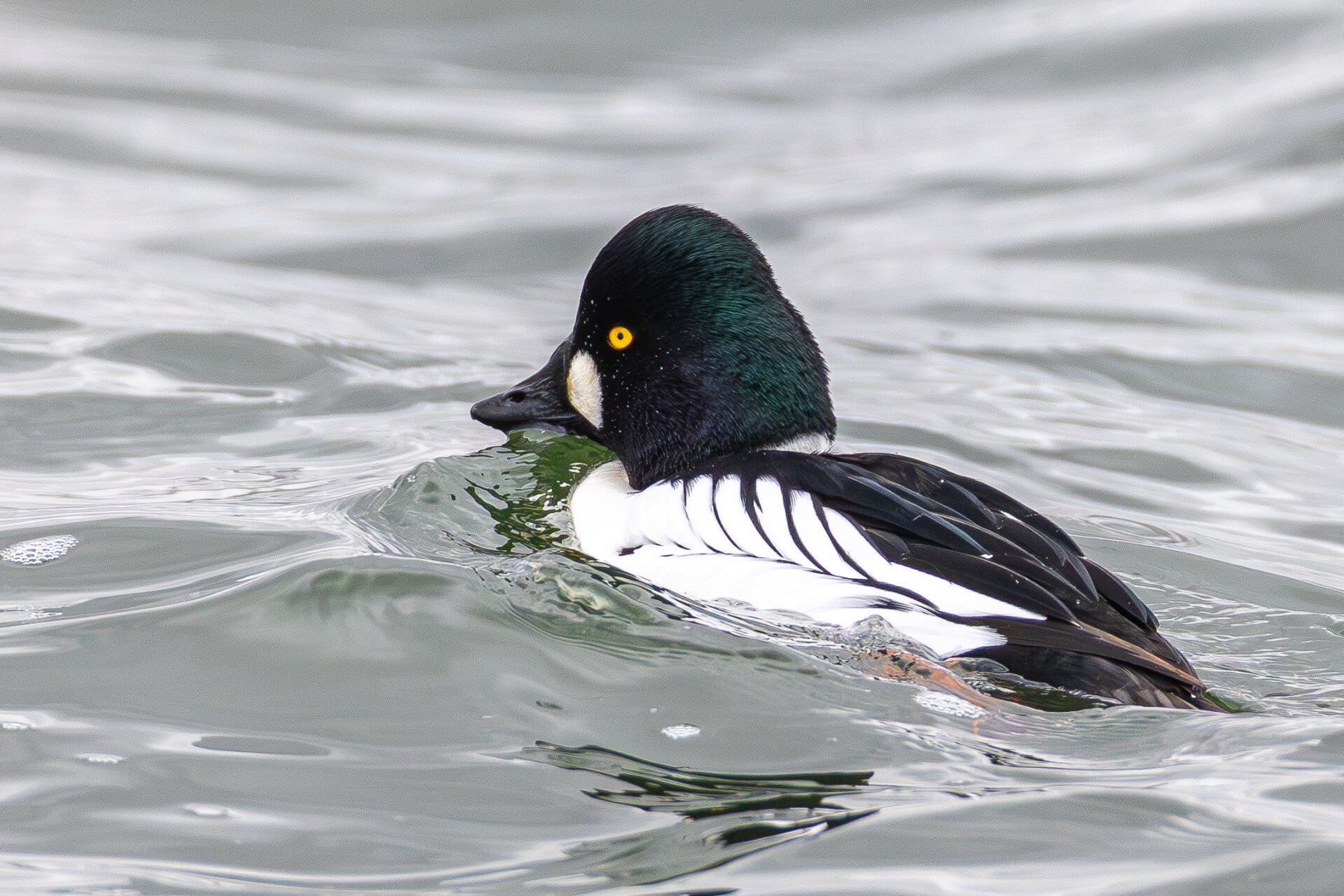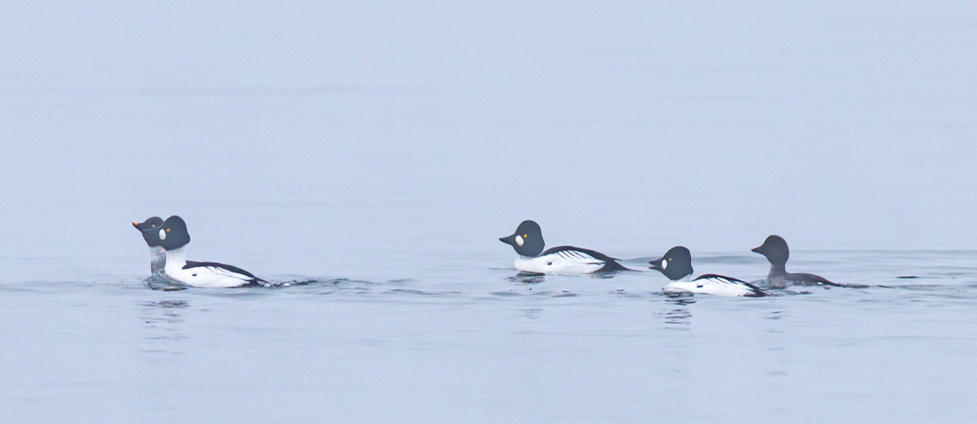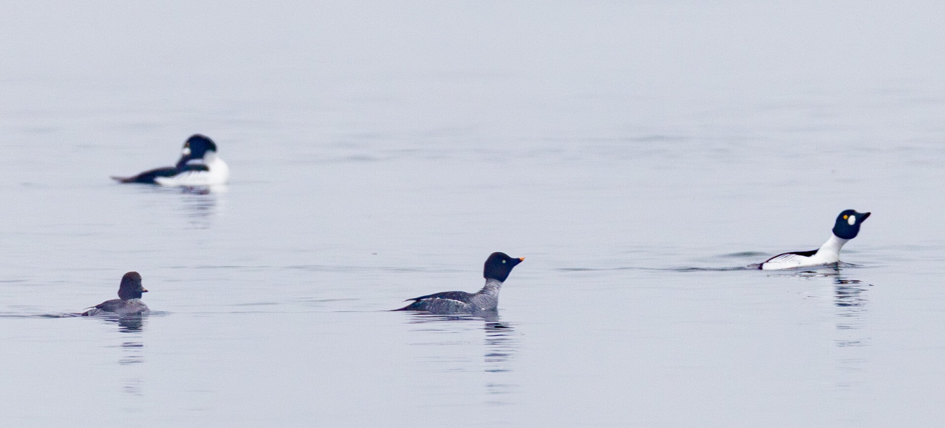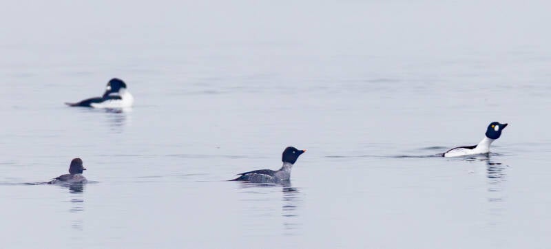 Die Schellente (Bucephala clangula) lebt in Ost-, Mittel- und Nordeuropa sowie in Asien und Nordamerika. Nach Norden reicht ihr Verbreitungsgebiet bis zur arktischen Baumgrenze. Ihren Namen verdankt sie dem charakteristischen, klingenden oder pfeifenden Geräusch, das ihre Flügel im Flug erzeugen und das an kleine Glocken oder «Schellen» erinnert. Der Gattungsname Bucephala stammt aus dem Griechischen und bedeutet «Stierkopf», was auf die gedrungene Kopfform der Ente hinweist, während clangula aus dem Lateinischen kommt und «klingend» oder «hallend» bedeutet. Schellenten benützen beim Tauchen im Gegensatz zur Eiderente ihre Flügel nicht. Diese Meeresentenart sind Höhlenbrüter und nutzen zur Brut bevorzugt Baumhöhlen. Länge: 42–50 cm / Spannweite: 65–80 cm / Gewicht: 600–1.150 g