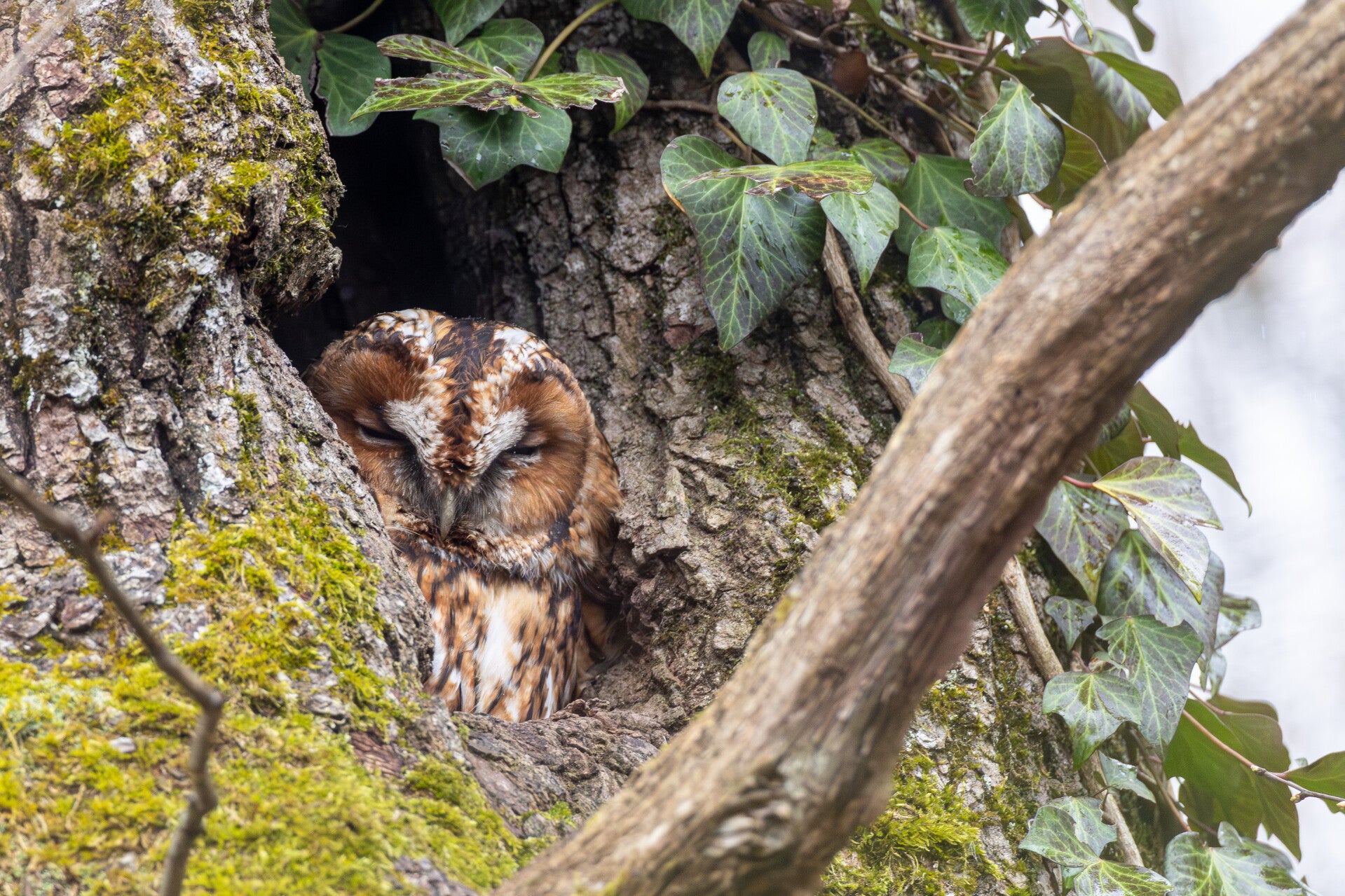 Der Waldkauz (Strix aluco) ist die häufigste Eulenart der Schweiz. Waldkäuze kommen in Mitteleuropa in verschiedenen Farbmorphen vor. Dies reicht von einer grauen Farbvariante über eine braune bis hin zu einer rostbraunen. Die Grundfärbung des Gefieders ist weder vom Alter noch vom Geschlecht bestimmt, wie lange Zeit vermutet wurde. Als Standvogel bleibt er ganzjährig im selben Revier. Er ist nachtaktiv und jagt vor allem Kleinsäuger wie Mäuse, gelegentlich auch Vögel, Amphibien oder Insekten. Die Brutzeit beginnt früh – oft schon im Februar. Gebrütet wird in Baumhöhlen, alten Spechthöhlen oder Nistkästen. Waldkäuze sind ortstreu und nutzen Reviere über viele Jahre hinweg. Länge: 37-39 cm / Spannweite: 94-104 cm / Gewicht: 330-590 g.