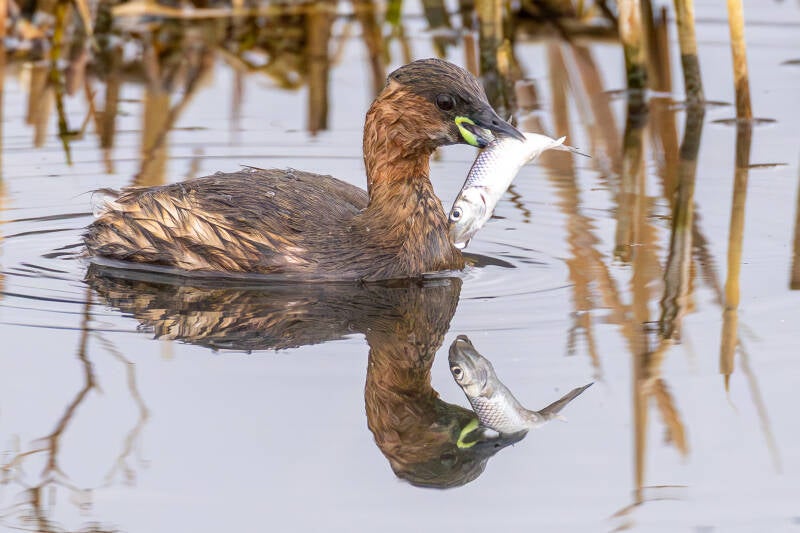 Der Zwergtaucher (Tachybaptus ruficollisist) ist der kleinste fischfressende Wasservogel. Seine Hauptnahrung besteht aus Insekten und deren Larven, sowie kleineren Fischen wie auch aus verschiedenen Weich- und Krebstieren. Die Tauchtiefe beträgt zwischen 1 und 2 (3) Meter. Sein Gefieder ist sehr dicht und kann durch Körperbewegungen «entlüftet» werden, damit er weniger Auftrieb hat. Länge: 25–29 cm / Spannweite: 40–45 cm / Gewicht: 100–200 g.
