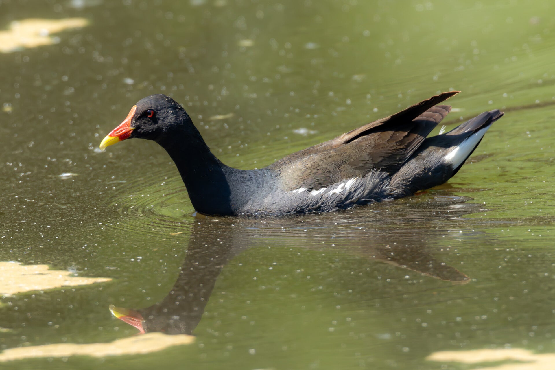 Das Teichhuhn, auch Teichralle genannt, trägt die wissenschaftliche Bezeichnung Gallinula chloropus, was «Grünfüssiges Hühnchen» bedeutet und auf die charakteristische Beinfärbung hinweist. Dieses wunderbare Geschöpf Gottes fällt besonders durch sein schwarzes Federkleid sowie die auffallend roten Augen und den roten Schnabel auf. Besonders bemerkenswert sind seine langen Zehen: Gott hat sie so geschaffen, dass das Teichhuhn nicht nur gut klettern kann, sondern auch auf Schwimmblättern laufen kann, weil sein Gewicht über eine grössere Fläche verteilt wird. In dieser besonderen Eigenschaft zeigt sich Gottes Fürsorge. Länge: 32–35 cm / Spannweite: 50–55 cm / Gewicht: 250–420 g.