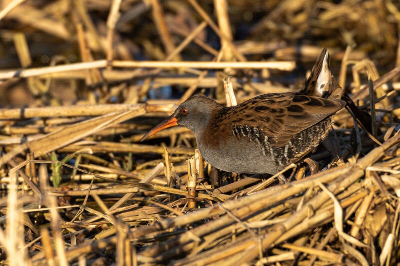 Die Wasserralle (Rallus aquaticus) ist nicht leicht zu entdecken, nur selten verlässt sie ihre Tarnung im Schilf. Sie verrät sich oft nur durch ihre «quiik-quiik»-Rufe, die stark an das Quieken eines Ferkels erinnern. Daher wird sie im Volksmund auch liebevoll „Schilfschwein“ genannt. Ausserhalb der Brutzeit sind sie Einzelgänger, die auch im Winter ihre Nahrungsreviere von etwa 300 m2 verteidigen. Wasserrallen sind bei uns ganzjährig ansässig. Länge: 24-28 cm / Gewicht: 110-150g / Flügelspannweite: 45 cm.