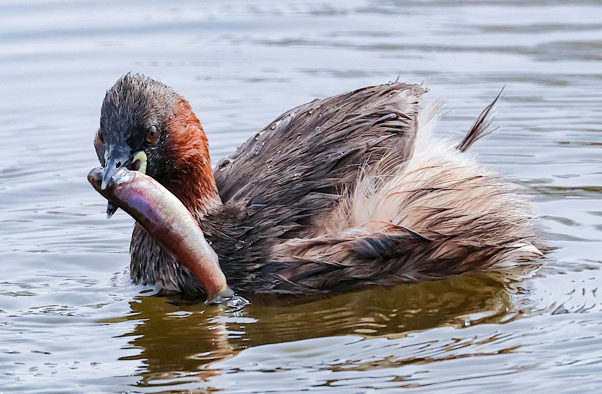 Der Zwergtaucher (Tachybaptus ruficollisist) ist der kleinste fischfressende Wasservogel. Seine Hauptnahrung besteht aus Insekten und deren Larven, sowie kleineren Fischen wie auch aus verschiedenen Weich- und Krebstieren. Die Tauchtiefe beträgt zwischen 1 und 2 (3) Meter. Sein Gefieder ist sehr dicht und kann durch Körperbewegungen «entlüftet» werden, damit er weniger Auftrieb hat. Länge: 25–29 cm / Spannweite: 40–45 cm / Gewicht: 100–200 g.