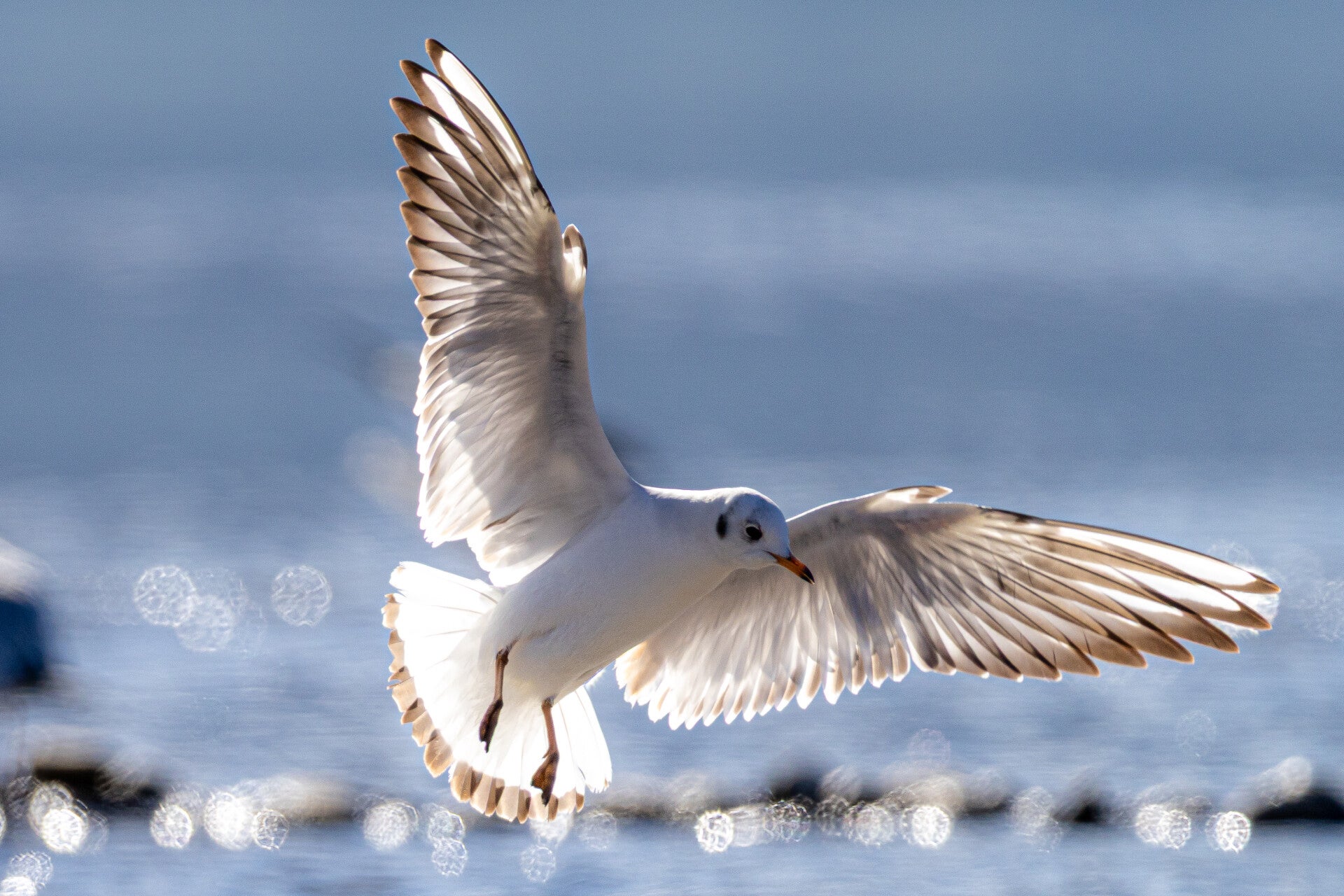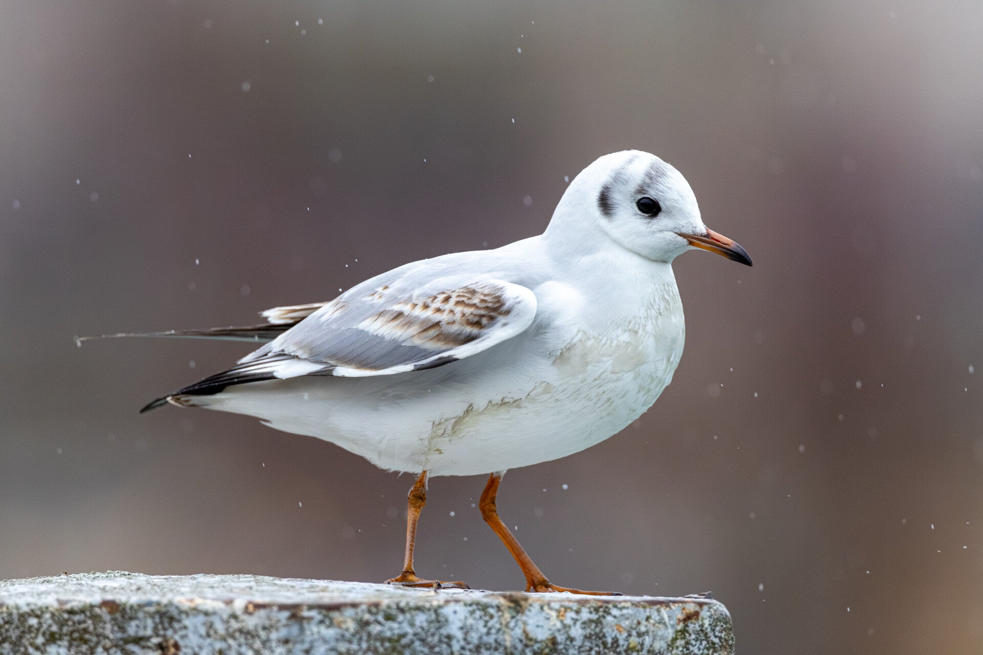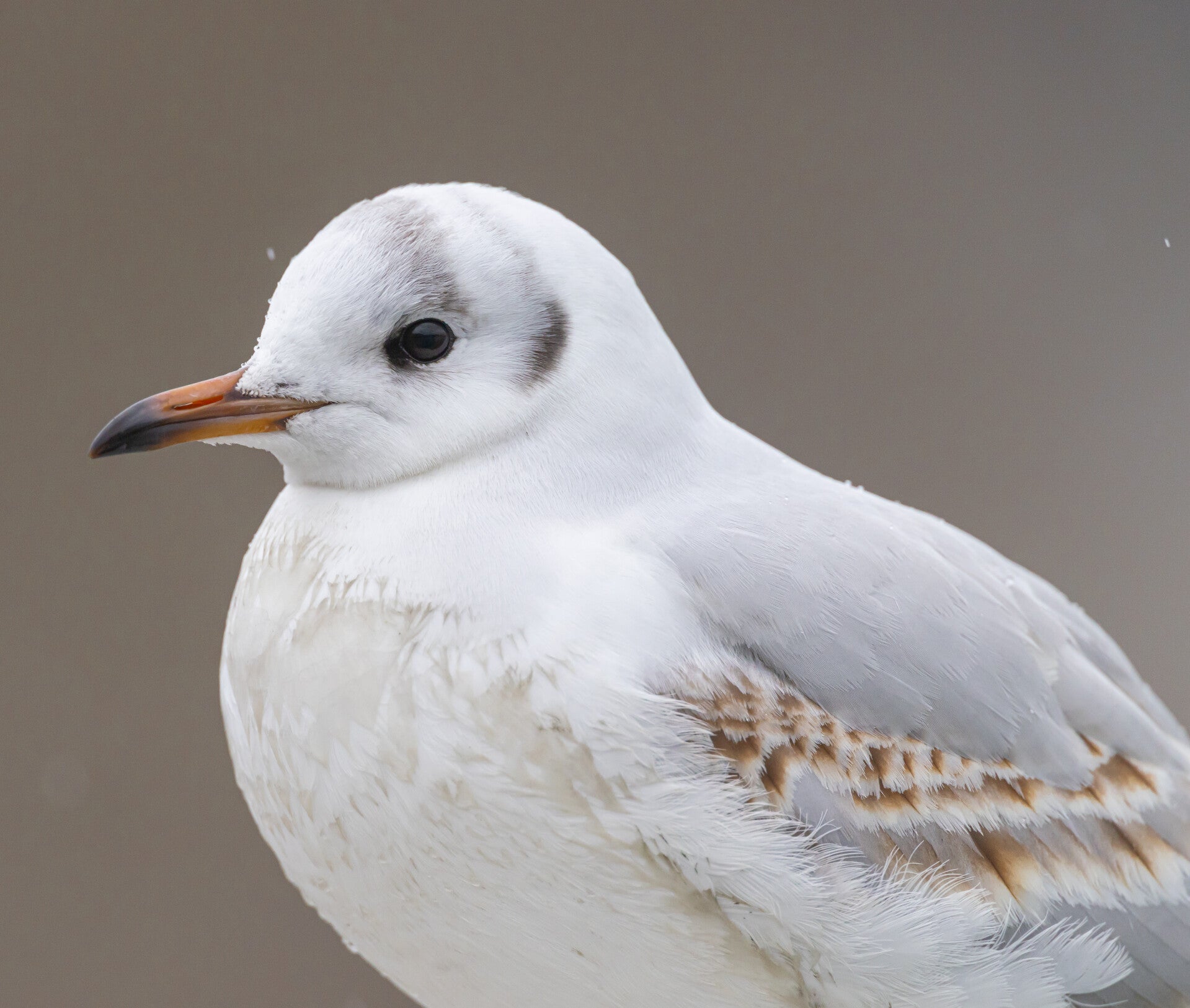 Die Lachmöwe (Chroicocephalus ridibundus). Im Prachtkleid von Anfangs März bis Juli ist der Kopf dunkel schwarzbraun, die Augen sind schmal weiss gerandet, der Rand ist vorn nicht geschlossen. Im Schlichtkleid sind nur die Augenregion und der Ohrbereich (Ohrfelck) diffus schwärzlich gefärbt. Der rote Schnabel hat nun eine schwärzliche Spitze. Die Lachmöwe gilt in der Schweiz als stark gefährdet (ca. 560–800 Brutpaare). Es überwintern grössere Bestände an unseren Gewässern. Ihr Name leitet sich von dem Wort «Lache» für Pfütze ab. Länge: 34-37cm / Spannweite: 83-101 cm / Gewicht: 225-350 g