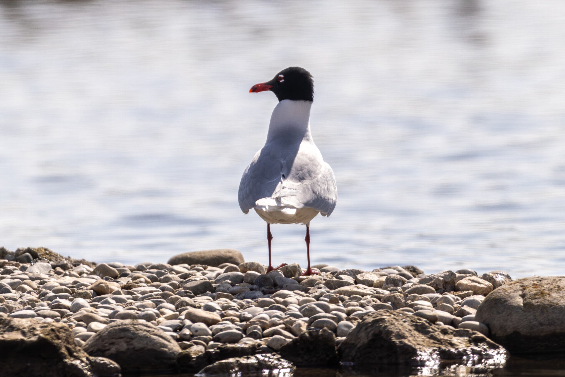 Die Schwarzkopfmöwe (Ichthyaetus melanocephalus). Der Kurzstreckenzieher lebt überwiegend an Küsten, wird jedoch gelegentlich auch im Binnenland beobachtet. In der Schweiz ist sie selten zu beobachten und brütet nur in kleiner Zahl. Im Prachtkleid besitzt sie eine auffällige, tiefschwarze Kapuze, die sich bis in den Nacken zieht. Die ähnlich aussehende Lachmöwe unterscheidet sich dadurch, dass ihre Kapuze dunkelbraun ist und nur bis zum Hinterkopf reicht. Der Schnabel der Schwarzkopfmöwe ist meist gelb bis orange gefärbt, kann aber auch rötlich erscheinen; charakteristisch ist ein dunkles Band zwischen Schnabelspitze und Schnabelbasis. Ihr Bestand gilt als gefährdet. Der wissenschaftliche Name Ichthyaetus melanocephalus stammt aus dem Griechischen: „ichthys“ bedeutet Fisch, „aetos“ Adler, „melas“ schwarz und „kephalē“ Kopf. Wörtlich lässt sich der Name daher als „schwarzköpfiger Fischadler“ übersetzen, wobei „Adler“ hier nicht im biologischen Sinn gemeint ist, sondern allgemein einen fischfressenden Vogel beschreibt. Die Schwarzkopfmöwe erreicht eine Länge von 37 bis 40 cm, eine Spannweite von 94 bis 102 cm und ein Gewicht von etwa 220 bis 350 g.