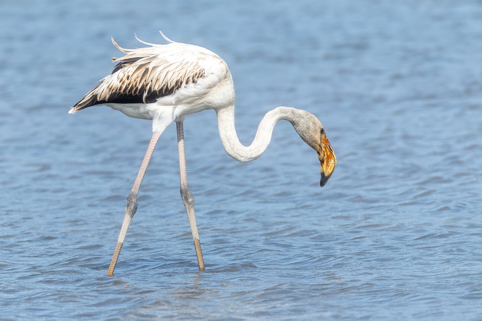 Der Rosaflamingo (Phoenicopterus roseus) ist die grösste Art der Flamingos, durchschnittlich 120–140 cm gross (davon machen allein die Beine 40–50 cm. Er kommt in Teilen von Afrika, Asien und Südeuropa vor. In den Niederlanden ist die nördlichste Population die, erfolgreich dort Jungtiere aufzog. Flamingos sind tag- und nachtaktiv, viele Arten fressen sowohl am Tage als auch in der Nacht. Beim Fressen halten Rosaflamingos den Schnabel knapp unter Wasser und trippeln im Kreis. So entstehen Wirbel, die kleine Wassertiere wie in einem Netz festhalten. Auch mit dem Schnabel erzeugen sie Mini-Wirbel und saugen ihre Beute dadurch besonders effizient auf – echte Jäger im Wasser.