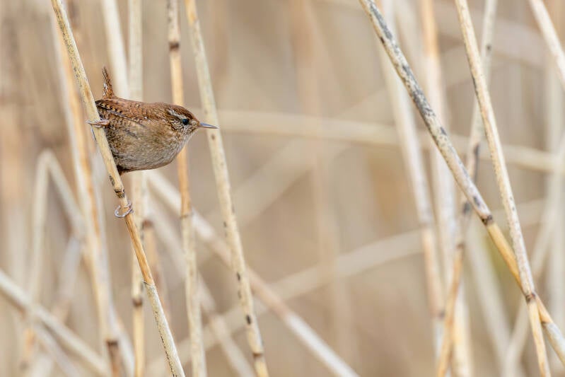 Der Zaunkönig (Troglodytes troglodytes) ist der drittkleinste Vogel Europas. Sein wissenschaftlicher Name bedeutet «Höhlenbewohner» und verweist auf seine besondere Nestbauweise. Das kugelförmige, vollständig geschlossene Nest wird aus Moos, Blättern und feinem Pflanzenmaterial gefertigt und sorgfältig ausgepolstert. Ein Zaunkönigsmännchen errichtet in seinem Revier mehrere Nester im Rohbau. Gelingt es ihm mit seinem Gesang, Weibchen anzulocken, können mehrere von ihnen gleichzeitig in diesen Nestern brüten. Das Brüten und die Aufzucht der Jungen übernehmen die Weibchen dabei weitgehend allein. In der Regel gibt es zwei Bruten pro Jahr. Trotz seiner geringen Grösse verfügt der Zaunkönig über einen erstaunlich kräftigen Gesang, der unter günstigen Bedingungen bis zu 500 Meter weit zu hören ist. In der Schweiz gilt die Art als Teilzieher und kann auch während der Wintermonate beobachtet werden.